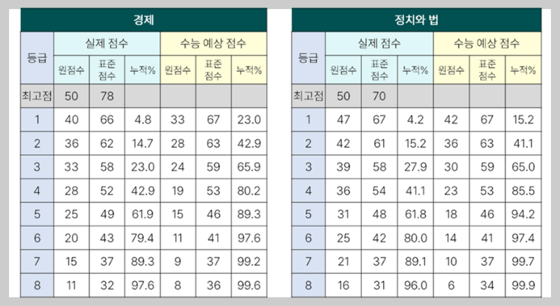 실수능의 점수 분포에 비추어 환산(보정)된 등급컷