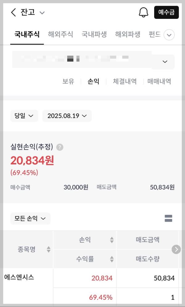 1호 : 에스엔시스 1주 매도 손익 20,834원